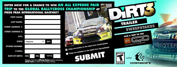 Motorsport and video games fans are in luck as DiRT 3 - the new installation to Codemasters' popular rally game is offering a no purchase required sweepstakes promo to win an all expense paid trip to the Global Rallycross Championship at Pikes Peak.