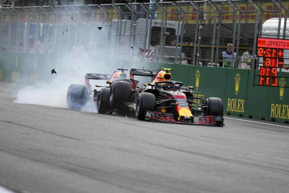 Back to the Red Bulls, lap after lap of close racing ended up in a crash when Verstappen shut the door on a late braking Ricciardo. The impact was strong enough to take both of them out, much to the anger of Red Bull team bosses Adrian Newey and Christian Horner. With debris scattered all over the track, the safety car was deployed yet again. However, the drama didn't stop there. While behind the safety car, Romain Grosjean tried to heat up his tires but ended up into the wall.