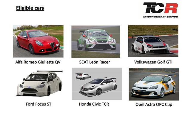 Eligible cars that have been drafted by TCR as of late include the Alfa Romeo Giulietta QV, the Ford Fiesta ST, the Honda Civic TCR, the Opel Astra OPC Cup, the Seat Leon Racer and the Volkswagen Golf GTI.