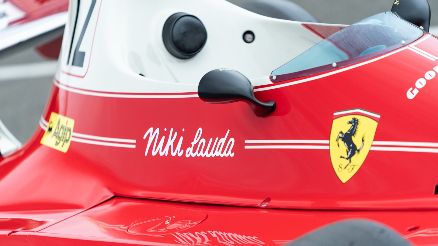 This particular car is chassis 022 which was piloted by Lauda himself during the 1975 Formula 1 season. It features a flat-12 engine and is only one of five 'transverseale' cars built by Ferrari for 1975. 'Transeveseale' refers to the car's unique transversely mounted transmission, hence the 'T' nomenclature in its name.