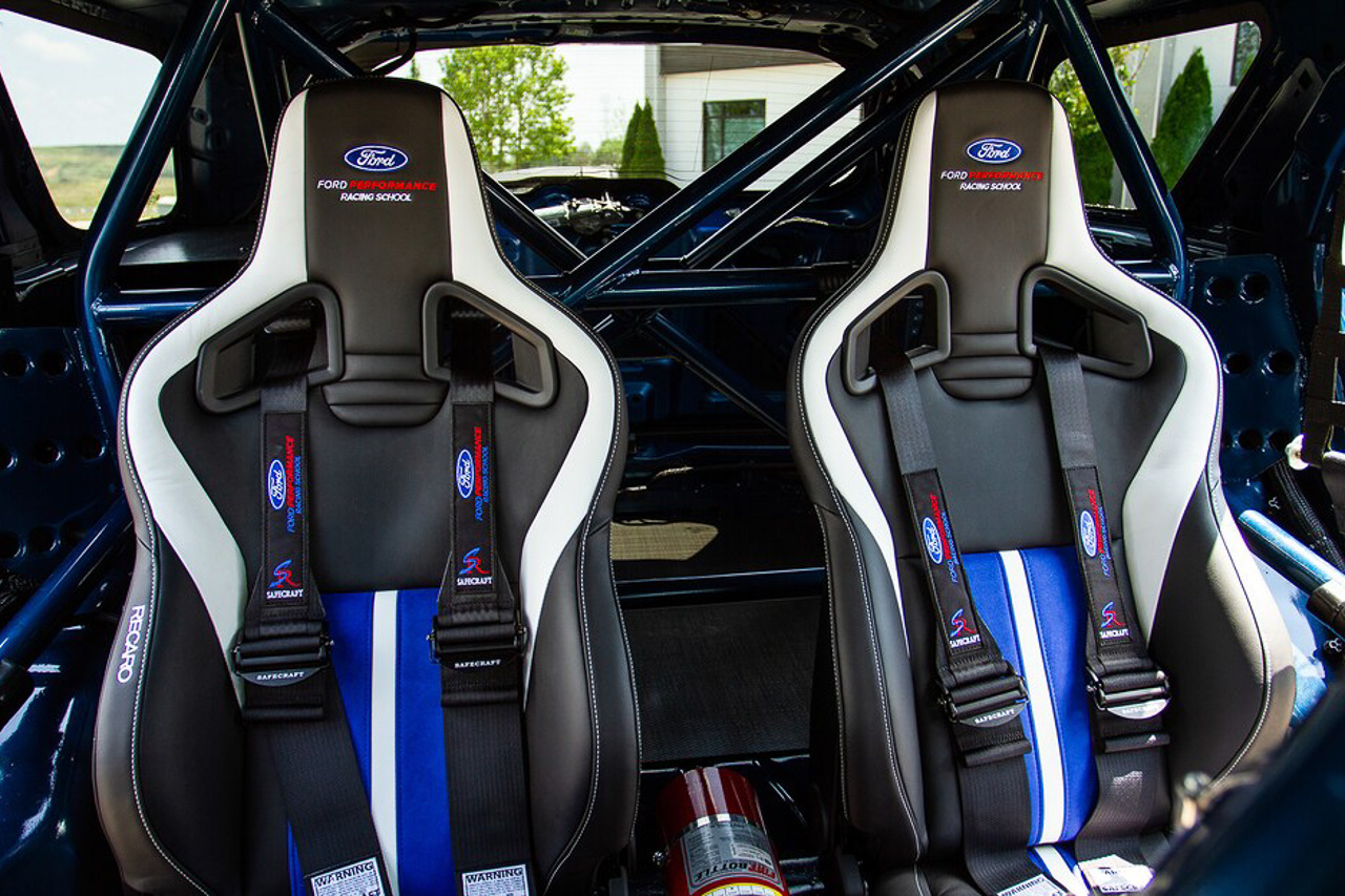 For better handling, Ford dropped its ride height by a few inches with a custom suspension. To ensure there is enough grip, a set of Michelin 315/30/ZR21 Pilot Sport Cup tires were fitted. Securing the occupants to their seats are 4 Recaro Cross Sporster CS seats and a 4-point safety harness. Last but not least is a custom-fabricated full safety cage.