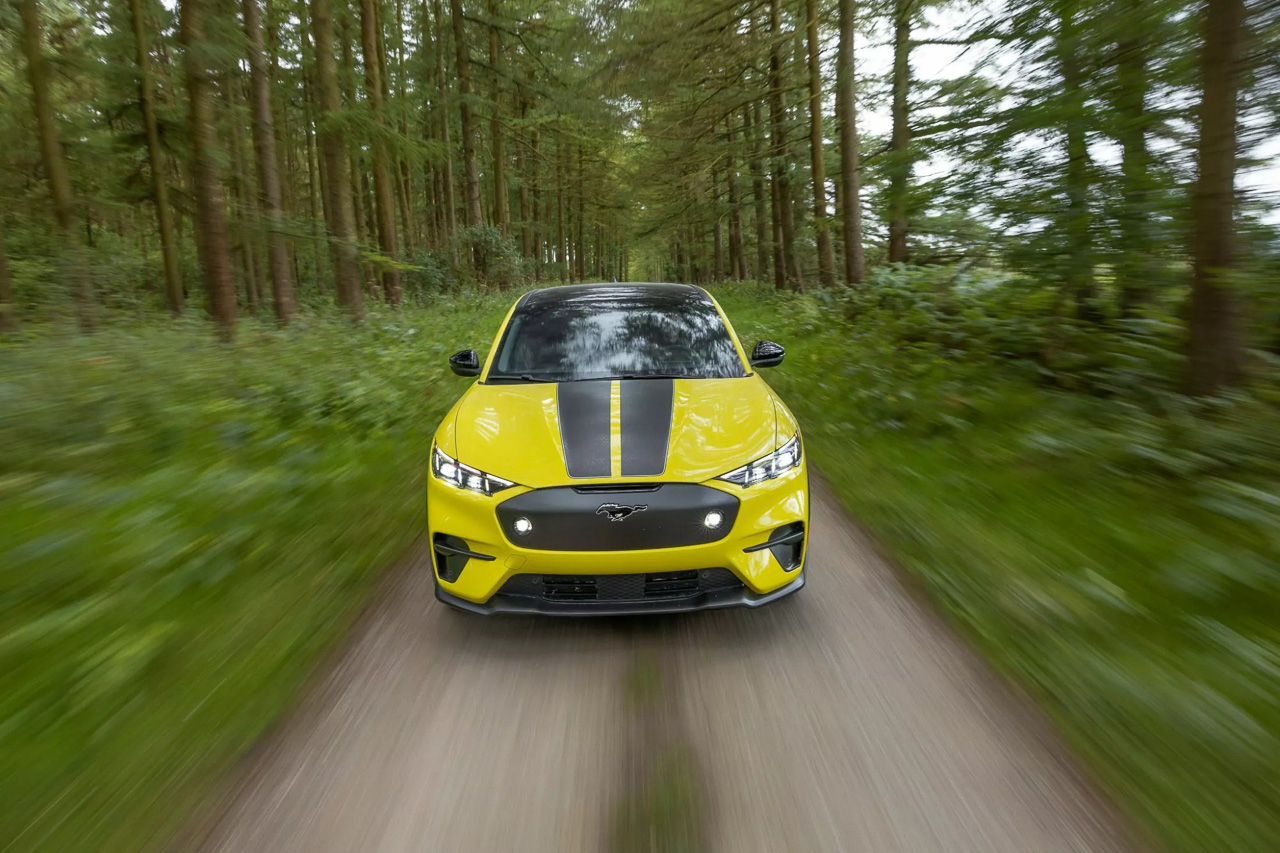 Externally, it is different from the typical Mustang Mach-E in so many ways. First is the unique suspension that is raised by 20 mm, has specially tuned springs, MagneRide shocks, and 385-millimeter front brake rotors with red-painted Brembo®-branded calipers. Second are the 19-inch gloss white alloy wheels with 235/55 R19 Michelin CrossClimate2 tires. Third is the unique contrasting accents, including upper and lower body moldings, a unique front splitter, a black painted steel roof, built-in rally-inspired fog lights, and the two racing stripes. Finally, to protect the body and motors from debris are protective film on the door cladding and fender arches and protective shielding for the front and rear motors.