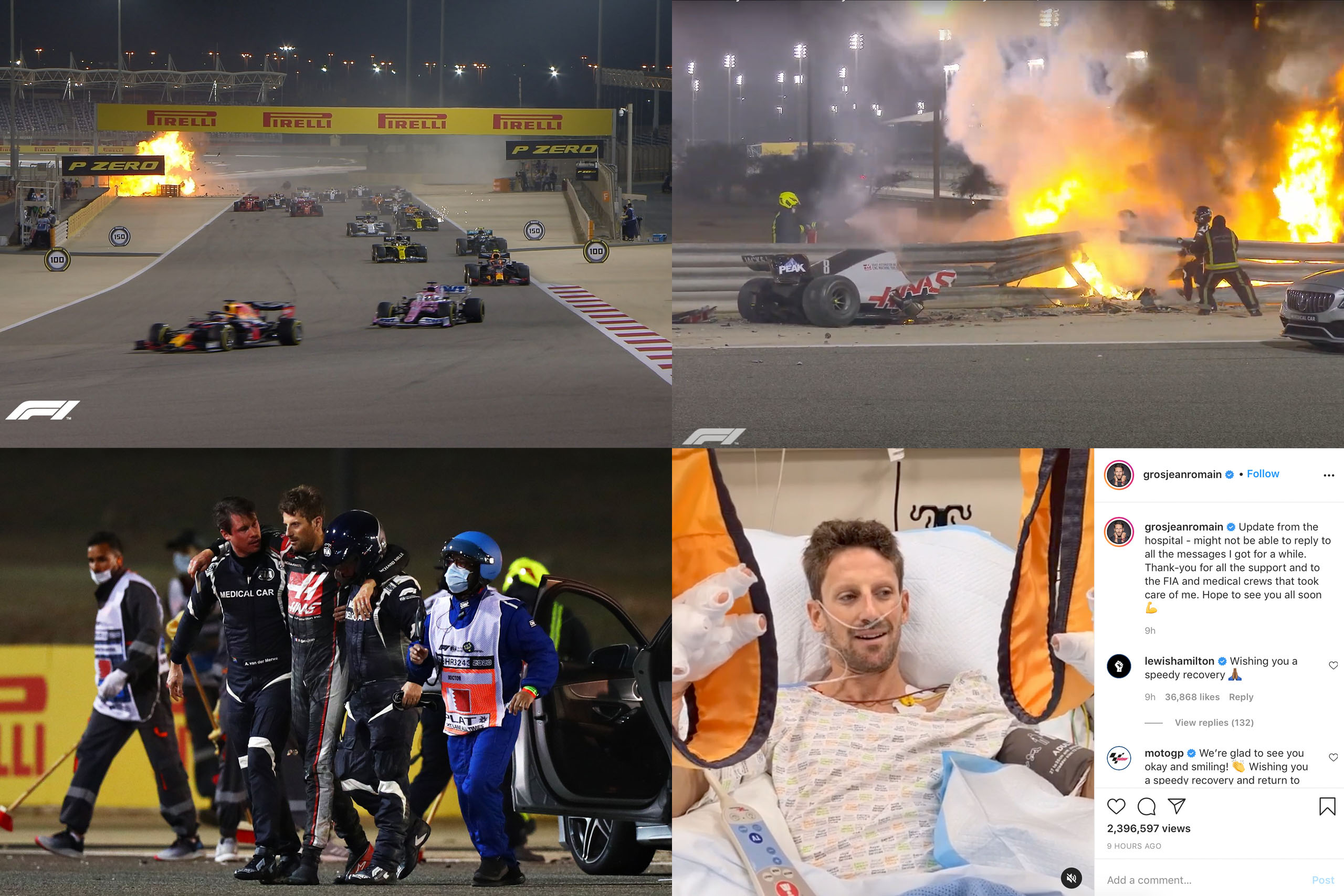 According to onboard telemetry, Grosjean slammed into the wall at 220 km/h with a force of 53 g. For the Haas driver to extract himself from the burning car and limp over the barrier is a miraculous sight. Medical car driver Alan Van Der Merwe and Dr. Ian Roberts both said it was the most intense fire they've seen in recent history. Since the accident, the two medical car staff along with other track marshals and volunteers, have been dubbed heroes. Van Der Merwe quickly sprung into action, while Dr. Roberts pulled Grosjean further away from the fire.