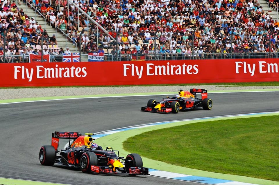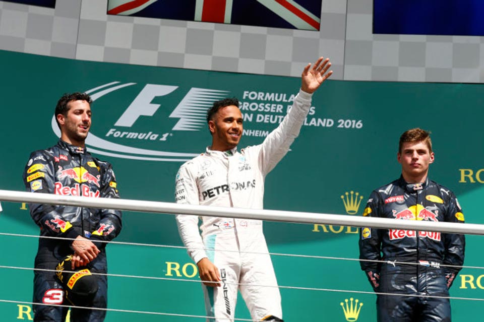 Reigning Formula 1 champion Lewis Hamilton has once again secured another victory for Mercedes-AMG F1 after dominating at this year's German Grand Prix at Hockenheim. Fellow teammate Nico Rosberg dropped down from pole position after suffering a poor start. This allowed Red Bull Racing duo, Max Verstappen and Daniel Ricciardo, to move up to second and third place early on in the race.