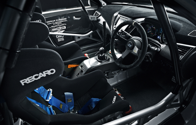 The Veloster Turbo is powered by a 1.6-liter turbocharged engine mated to a six-speed manual transmission gearbox, and a stainless steel high flow exhaust system. The interior was stripped down to make room for Recaro carbon racing seats with multi-point seatbelts, Sparco race steering wheel, an anti-glare dashboard, and an FIA/CAMS compliant roll cage.