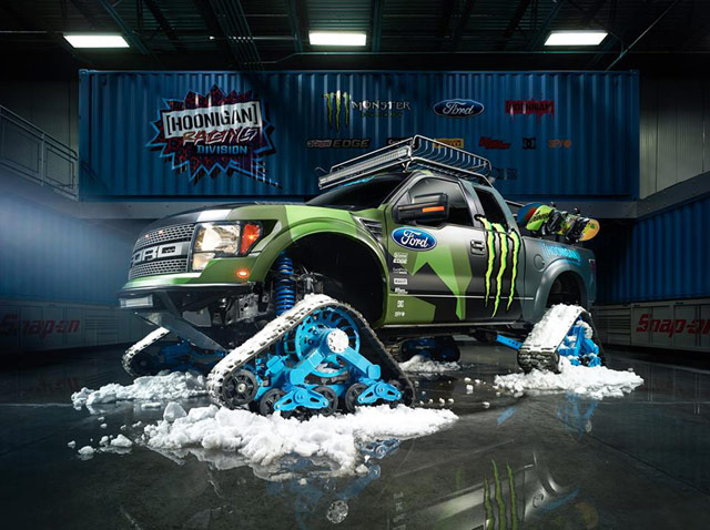 The F-150 RaptorTrax is built from a Ford Racing F-150 Raptor pickup truck and was enhanced by Special Vehicle Concepts in California. The truck is equipped with snowboard racks, a roof basket, a rear-mounted winch, interior storage for snacks and drinks, an exterior stereo for blasting music on-site, exterior-mounted Rigid Industries lighting, and four burly Mattracks.