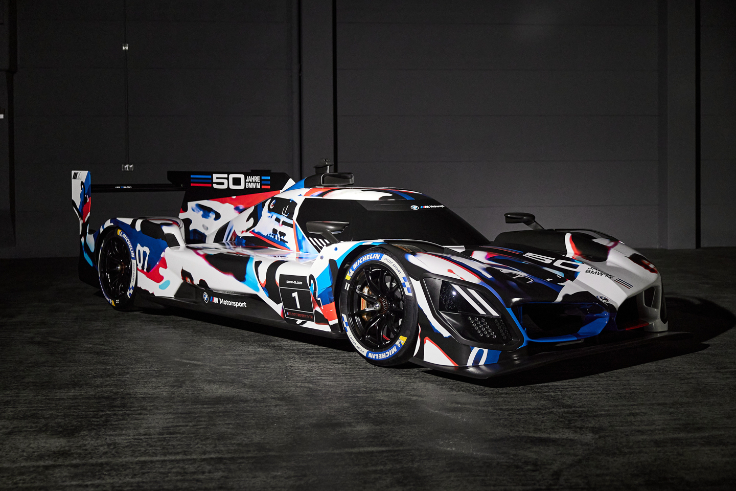 As expected, the Le Mans race car is unmistakably a BMW with its wide kidney nose and features a camouflage livery commemorating the manufacturer's 50 years of motor racing history and their trademark BMW M colors.