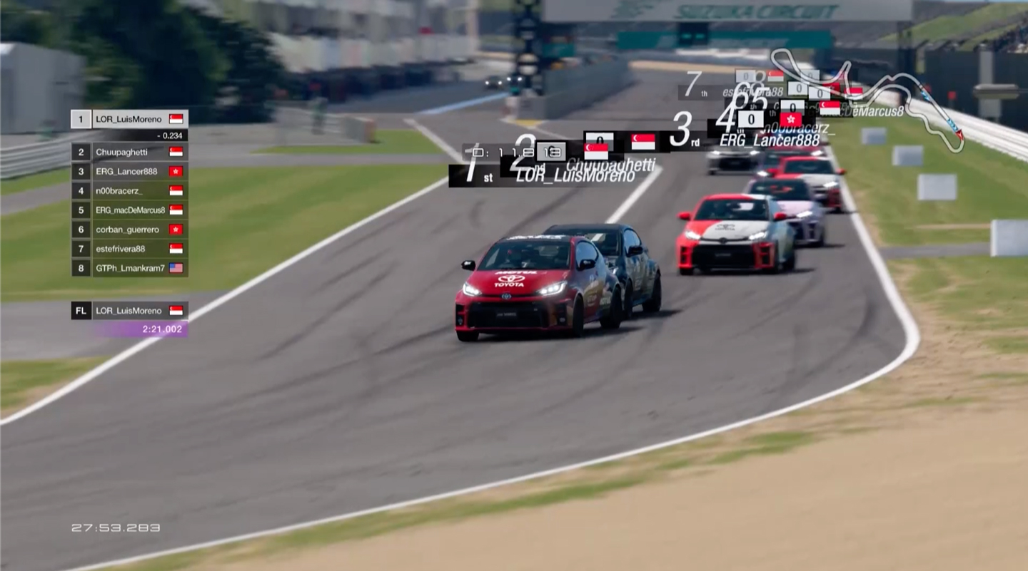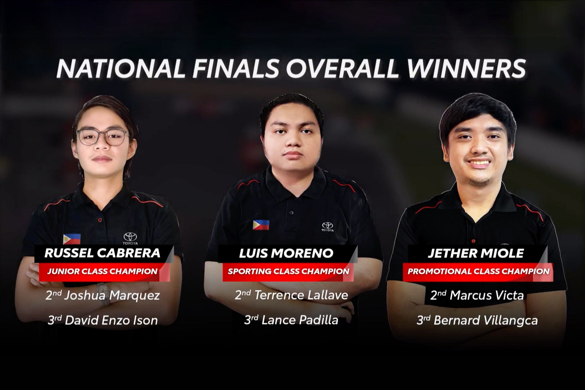 After three rounds of intense racing, three champions from the Junior Class, Promotional Class, and Sporting Class emerged. The three races held were held in the iconic Tsukuba Circuit, the fictional track of Kyoto Driving Park, and the Suzuka Circuit. In the end, Russel Cabrera from the Junior Class, Jether Miole from the Promotional Class, and Luis Moreno from the Sporting Class emerged victorious. As champions of the 2021 Toyota Gazoo Racing GT Cup, they will take home a cash prize of PHP 100,000 and a brand-new Sony PlayStation 5 each.