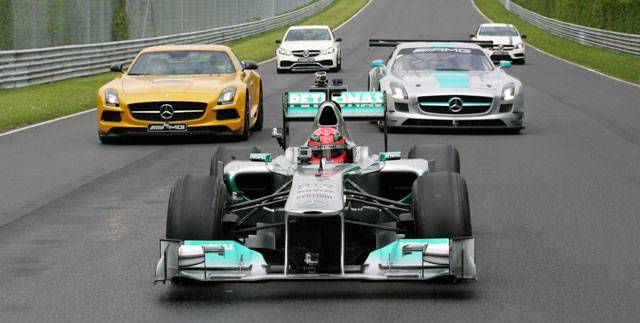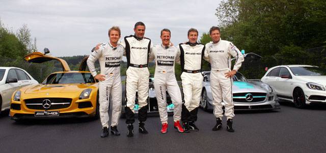 Schumacher, now representing the brand as its ambassador, drove through the course with four Mercedes-Benz AMG vehicles driven by fellow Mercedes-Benz drivers Nick Rosberg, Bernd Schneider, Karl Wendlinger and Bernd Maylander.