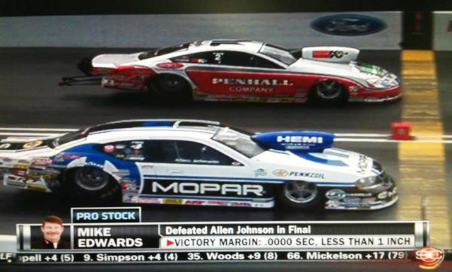 Veteran Pro Stock driver and former world champion Mike Edwards claimed his fourth victory in a row at Bristol Dragway with his holeshot win in the closest NHRA national event final round ever, Mike Edwards left on Allen Johnson by a .005 to .018 margin and won the race with a 6.674 to Allen Johnson's 6.661. The margin of victory was .0000-second, making the Pro Stock contest a virtual dead heat in which only the computers could determine the winner.
