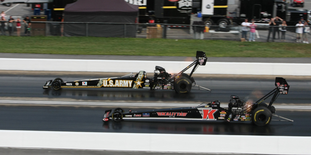 Schumacher’s U.S. Army dragster ran like a bracket car all during Sunday’s eliminations, with his slowest pass coming in the final round against long-time on-track rival, Doug Kalitta. Schumacher did his job on the starting line; his reaction time was four-hundredths better than Kalitta’s, leading to Schumacher’s slower but winning e.t., 3.819 seconds at 342.28 mph.