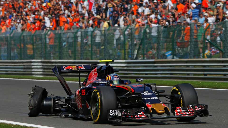 The contact with the two Ferraris saw Verstappen slipping down the order. Raikkonen's dramas were far from over however. As he dove to the pits for a front wing change, his car briefly caught fire but, fortunately, the crew were able to put it out quickly. Back on track, the scattered debris claims its first victim. Carlos Sainz Jr. blows a tire upon exiting Les Combes and the remnants of the Pirellis snag on the rear wing, breaking it off in the process. He retires from the race.