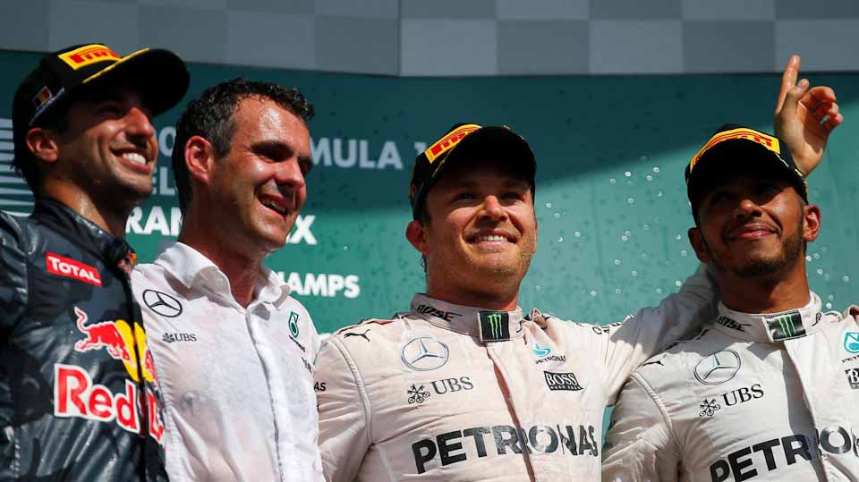 Towards the end of the race, the field began stretching the limits of tire life. While Rosberg reported no problems, Ricciardo said that he was starting to feel the loss of grip. Hamilton, who pitted later, was gaining on the Australian and was one DRS overtake away from second place. Ricciardo was able to hold off Hamilton as the latter degraded his tires but at the expense of giving Rosberg a healthy lead. Rosberg crossed the line first with Ricciardo some 14 seconds behind.