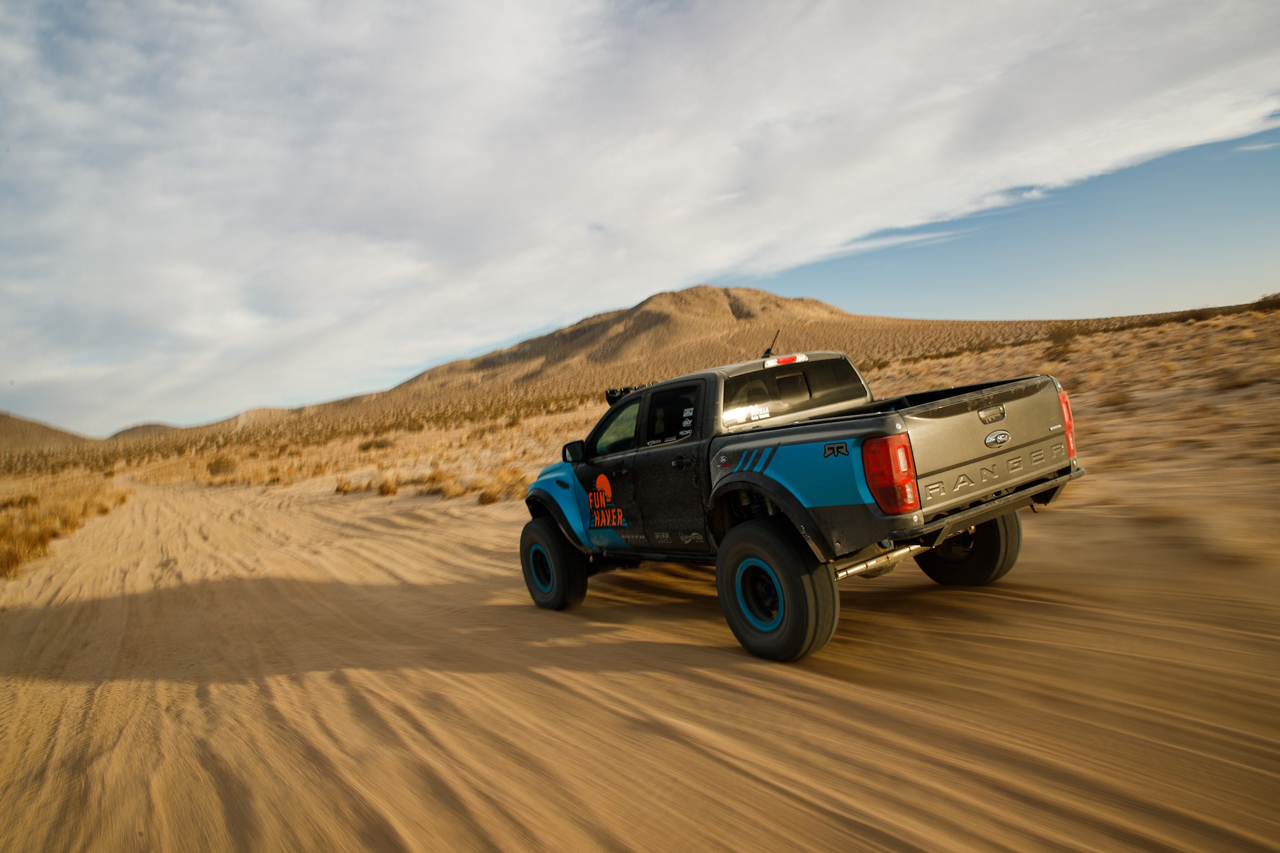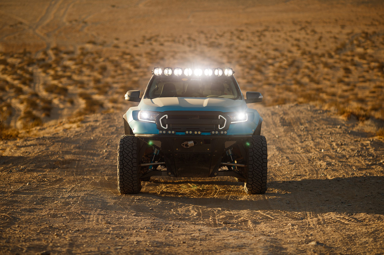 The Fun-Runner is built by RTR and is based on a standard 2020 Ranger 4x4 XLT. However, nearly all the components have been swapped out to turn it into the wild pickup you see before you. A Kibbetech suspension was fitted with an independent setup in the front and a multi-link at the rear. King Off-Road coilovers provide 15 and 18 inches of travel in the front and rear, respectively.
