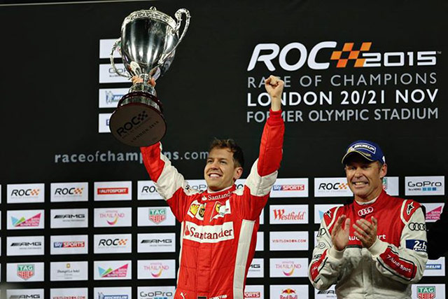 Ferrari Formula 1 driver Sebastian Vettel has won the 2015 Race of Champions (ROC) held at London's Olympic Stadium. Vettel bested 19 fellow motor sport giants and claimed his first ROC crown.