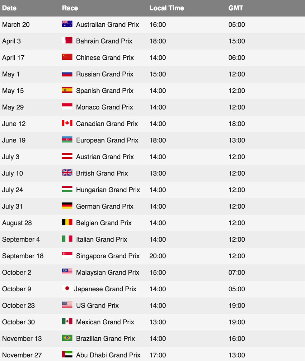 Start times for 2016 F1 season have been confirmed by the FIA.