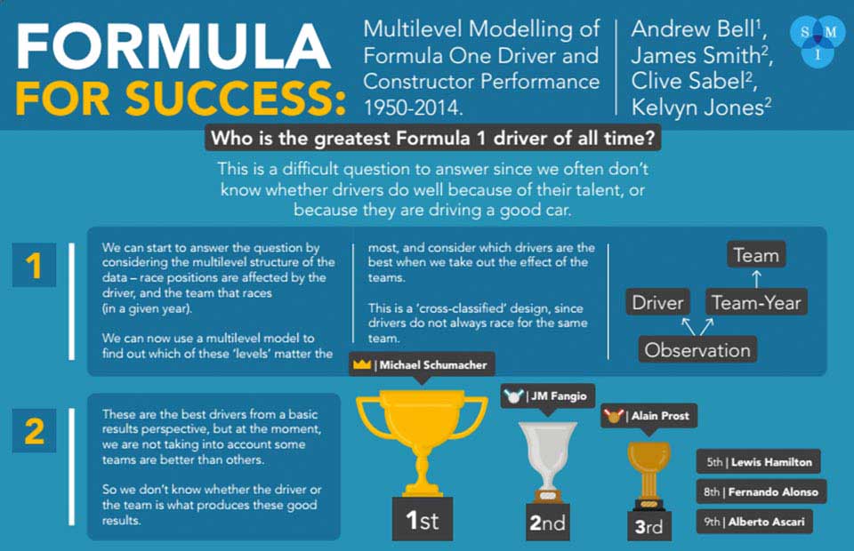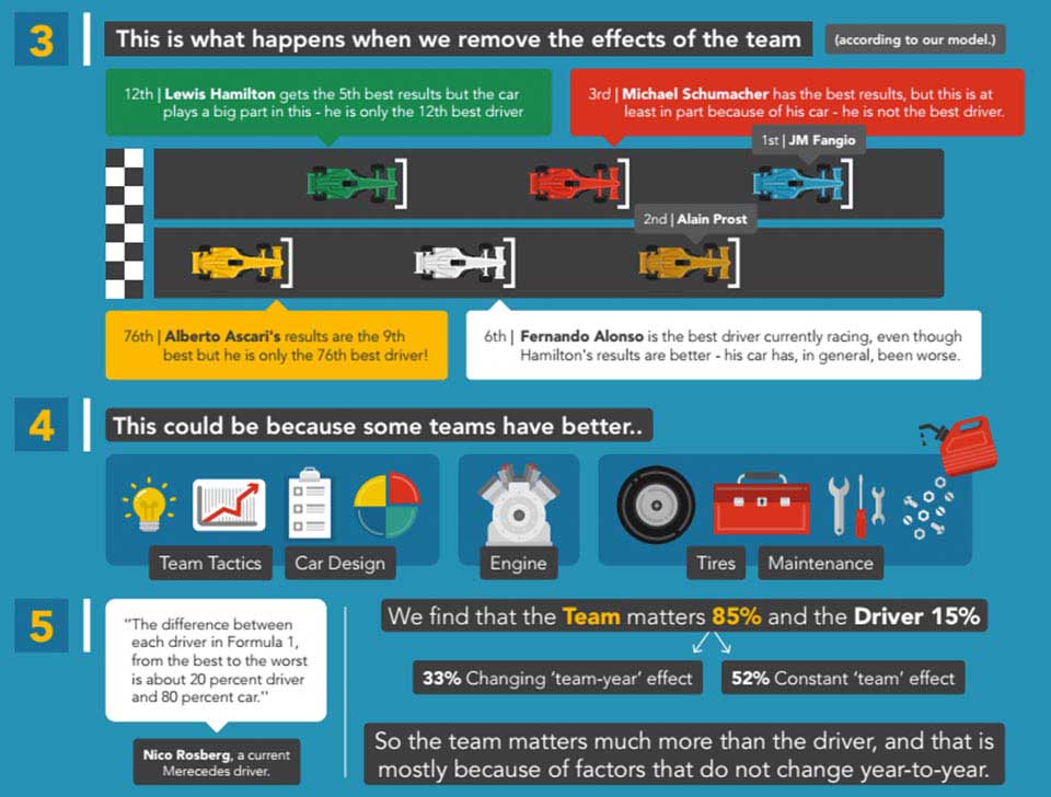 To compensate for the different eras, the researchers made a “multilevel” statistical model. The model took into account team and driver performance between 1950 and 2014, and included the tracks and weather conditions in which the drivers raced with.