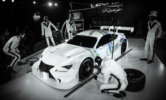 The Lexus RC F GT500 was presented in an unusual way by the Lexus Racing racing team. Incorporating a Daft Punk inspired theme for the vehicle promotion at the Tokyo Auto Salon, the Lexus racing team wears a custom double-breasted suits, top hats, headphones, and reflective sunglasses.