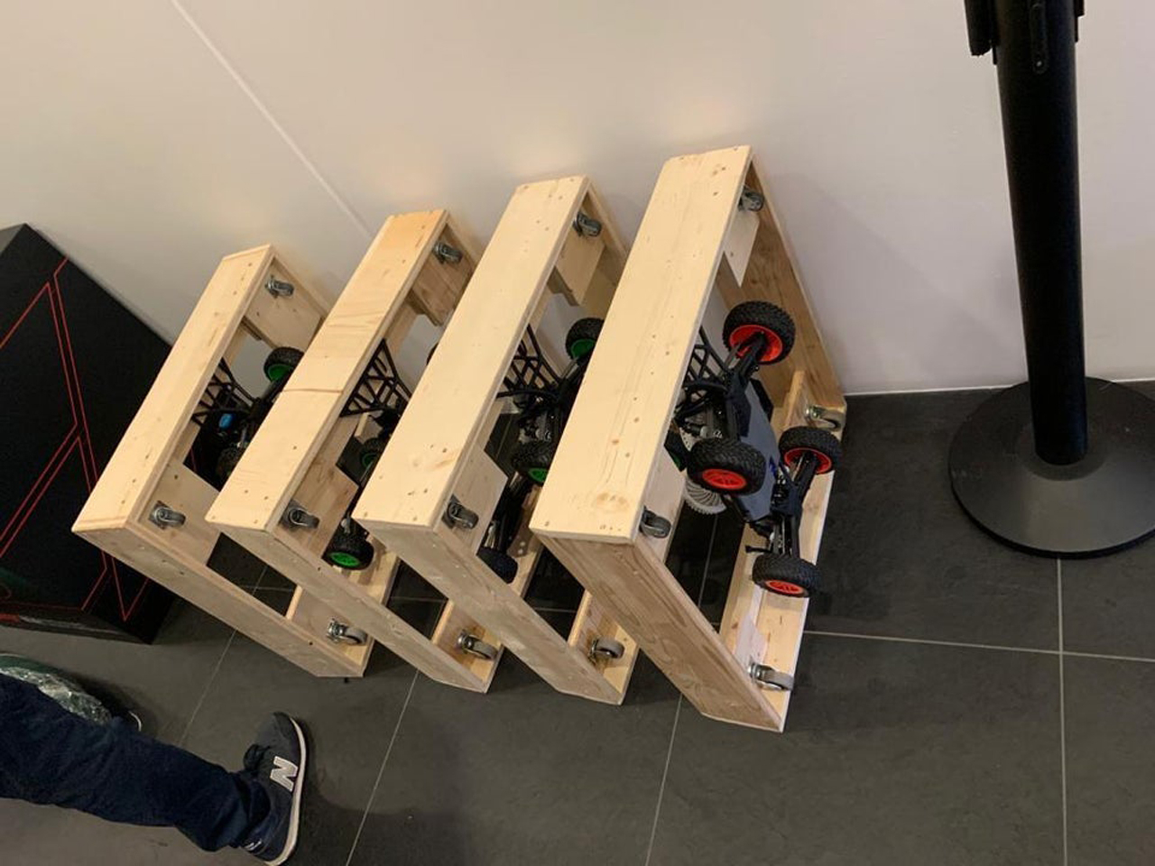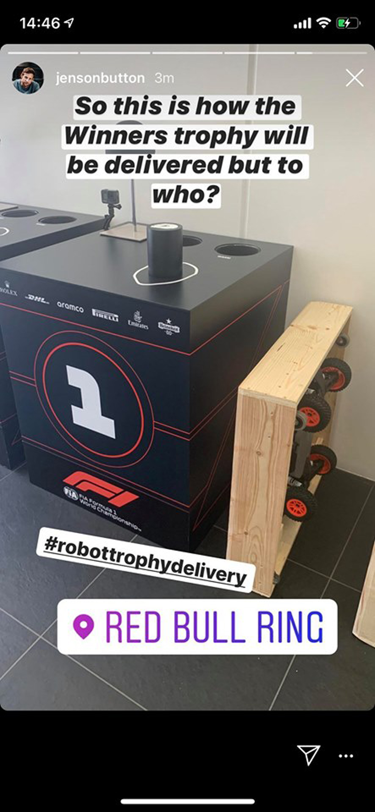 A Redditor who goes by the name of 'Bksydd' has posted a photo of how the trophy delivery system was used in the Styrian Grand Prix. Interestingly enough, it is not that high-tech or complicated and even caught the attention of F1 champion Jenson Button. They are simply R/C cars (Traxxas Slash, by the looks of it) attached to the bottom of a plywood box which then fit onto the trophy stand. It's a simple solution, but looks so elegant at the same time.