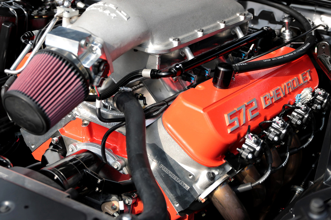At the heart of this Camaro is no ordinary motor. It's a big-block, 9.4-liter (572 cubic-inch) V8, the largest engine ever to be fitted on a COPO Camaro. Exact figures have yet to be revealed. But Chevy did mention this engine has a cast-iron block, aluminum heads, forged steel crankshaft, forged steel connecting rods, and forged aluminum pistons.