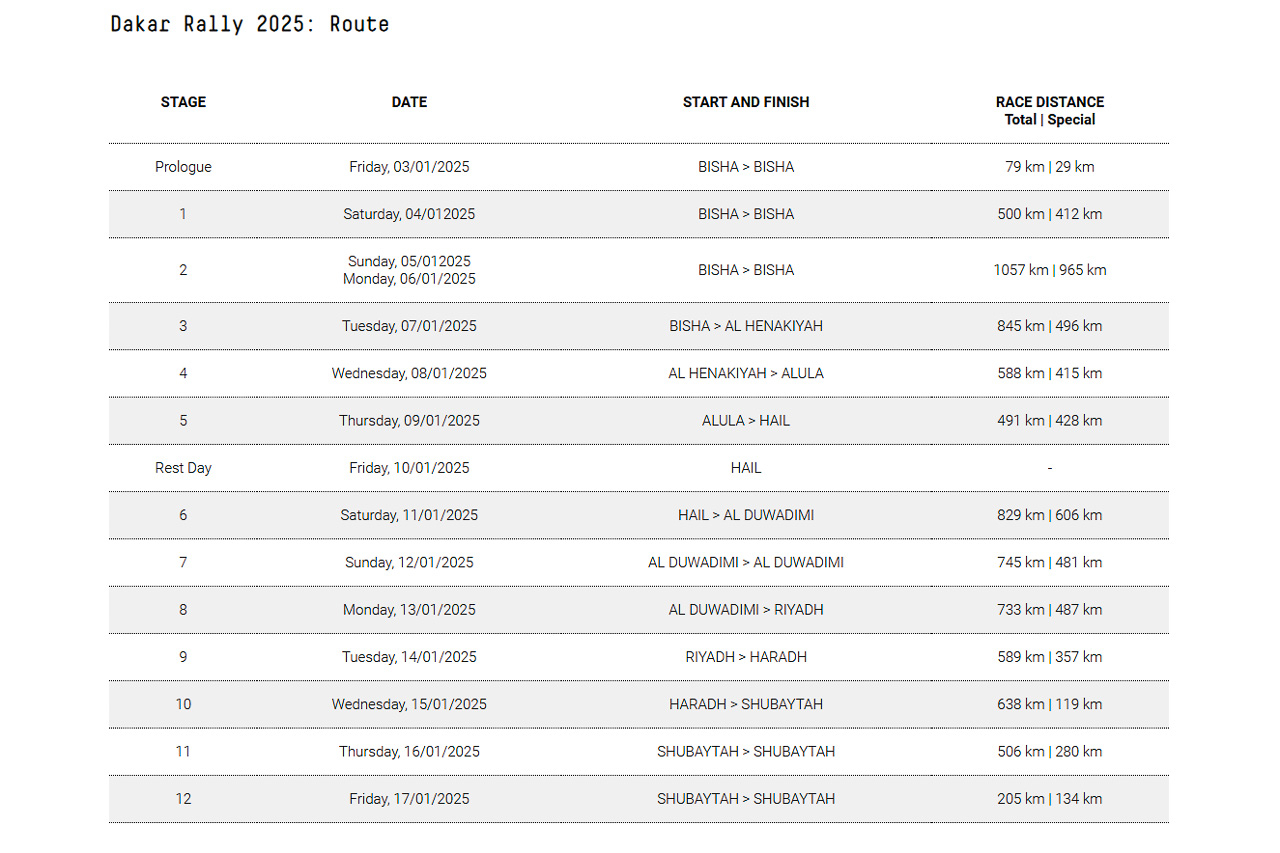 In total, the race will include 12 stages with stage distances ranging from a short yet demanding 134-km final day to the grueling 606-km Stage 6. The rally will conclude in Shubaytah on January 17, where a celebratory podium awaits the successful finishers.
