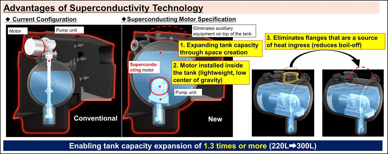 The automaker is also working on superconductivity technology to expand the potential of liquid hydrogen technology by installing a superconducting pump inside a fuel tank. By using a compact superconducting fuel pump, Toyota says it creates more volume, which translates to more than a 1.3-fold increase in tank capacity, thus increasing cruising range. There's also the matter of keeping hydrogen in liquid form, which can be done by keeping the temperature at -253 degrees Celsius, which can be troublesome when used in production cars.