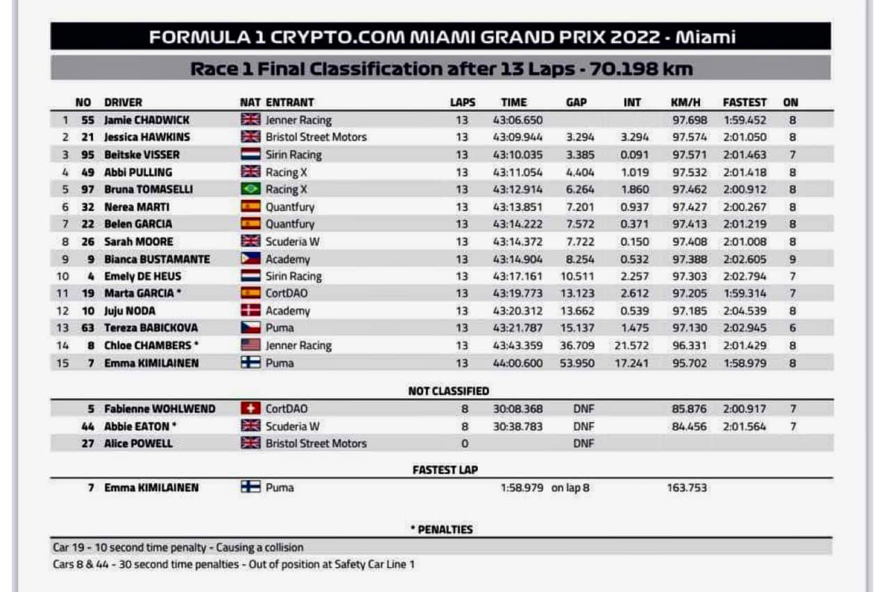 However, after post-race penalties were handed to 2nd-placed Marta Garcia and 8th-placed Chloe Chambers, the final standings saw Garcia drop to 11th and Chambers to 14th. This meant Jessica Hawkins has clinched 2nd ahead of Beltske Visser.