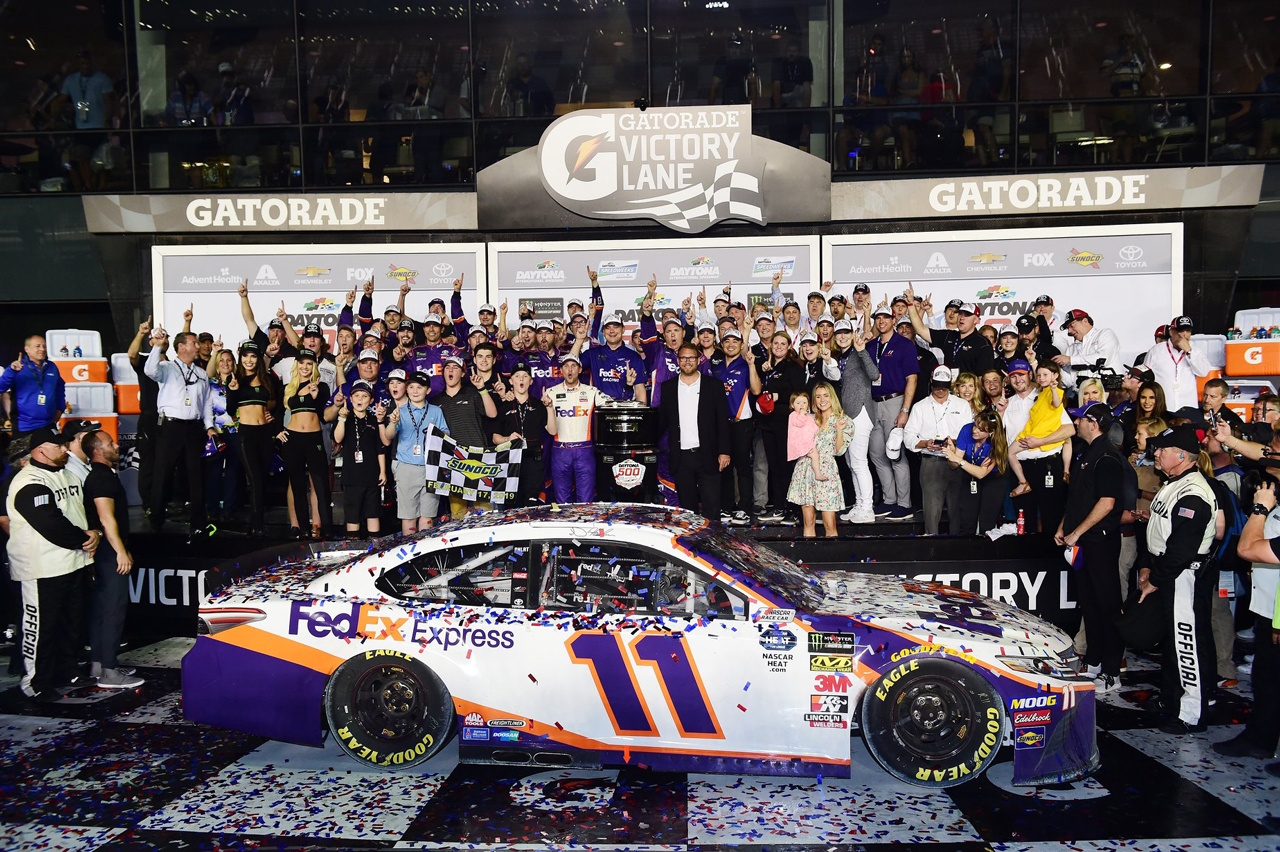 After the restart, Denny Hamlin was able to hold off the lead ahead of reigning Cup Series Champion Joey Logano and teammate Kyle Busch to win the 61st Daytona 500, marking his second win at the event.