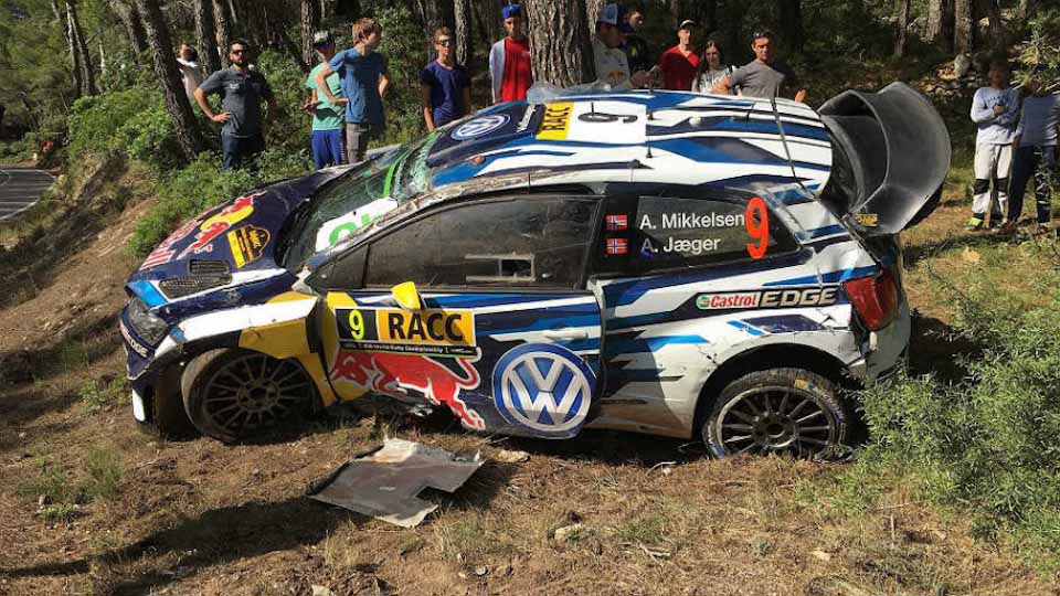 Mikkelsen's bid for the championship ended when he rolled his Polo WRC in a bid to chase Ogier for second place. He and co-driver Anders Jaeger were unhurt after the car clipped a barrier and rolled the car several times before coming to a rest.