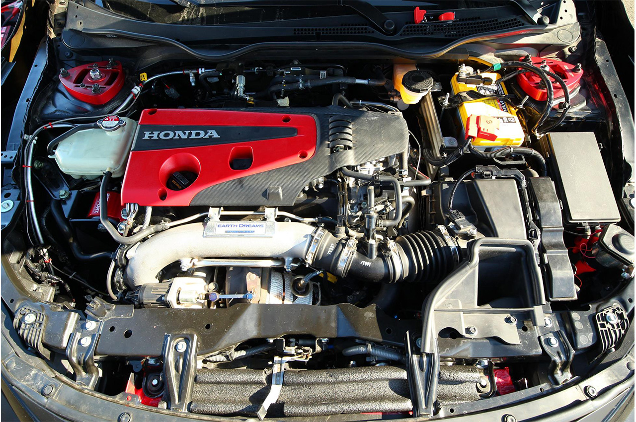 Major modifications to the production Type R include a high-flow front grille, a J's Racing FRP vented hood, CSF radiator and oil cooler, an HPD/Borla downpipe and turbo back exhaust, a 6-speed manual transmission with strengthened 3rd and 4th gears, an HPD/Cusco limited slip differential, HPD Girodisc 2-piece front brake rotors and HPD brake inlet ducts, an HPD/Pyrotect bolt-in FIA 16-gallon fuel cell, a welded multi-point racing cage, and an OMP racing seat with 6-point harness.