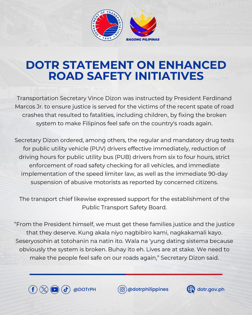Transportation Secretary Vince Dizon announced today that he will sign a Department Order that will require all PUV drivers to undergo mandatory drug testing. According to Dizon, the DOTr wants the riding public and motorists to be safe on the road. But due to a broken system and erring drivers who don't follow road safety, it has resulted in multiple incidents that have claimed the lives of people and injured others.