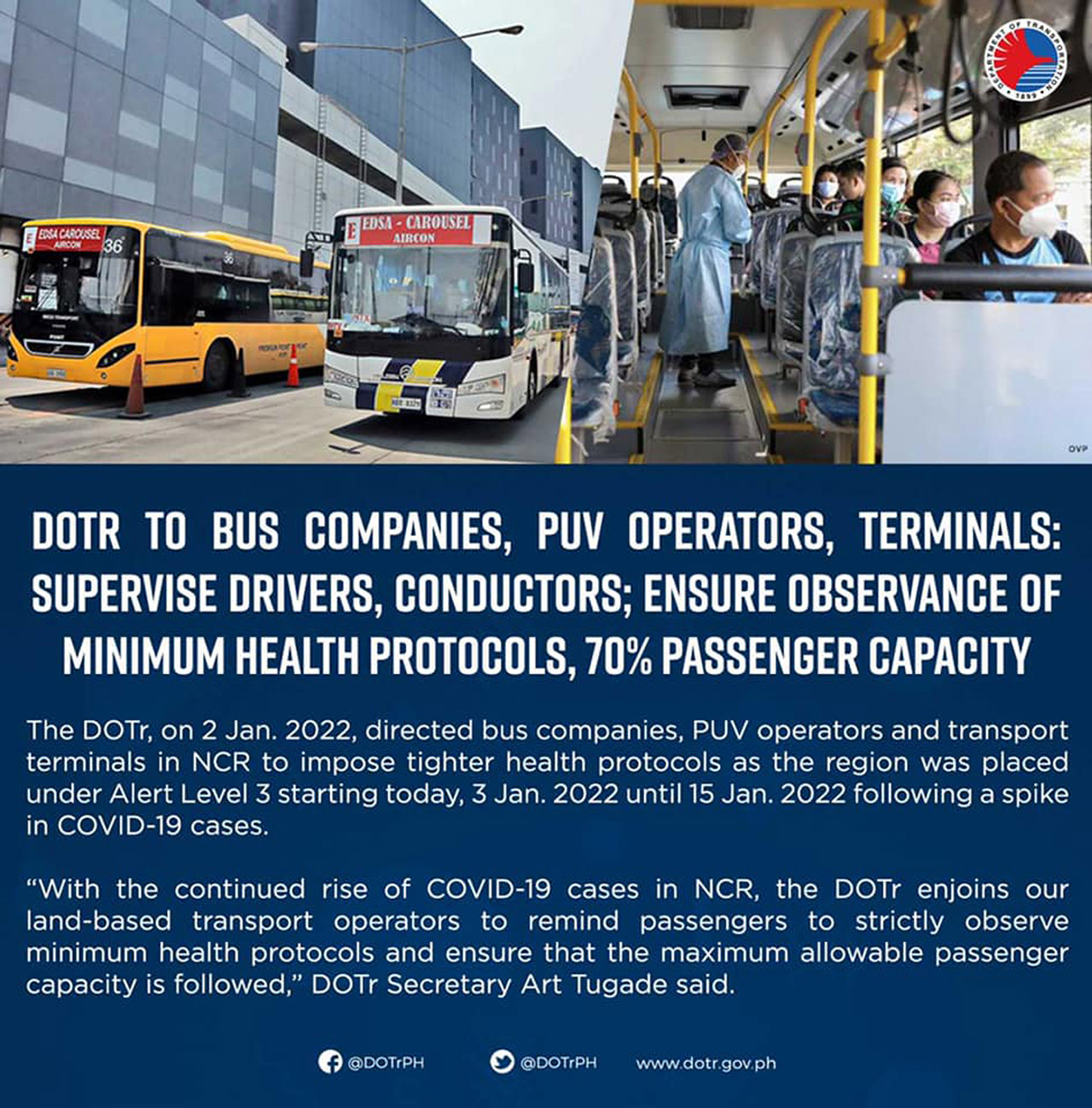 “The DOTr Road Sector will make sure that the maximum passenger capacity is strictly followed. As COVID-19 cases increase in the NCR, we are urging our transport stakeholders, especially the riding public, to observe health protocols, and to be wary of PUVs not following the allowable capacity. This is the only way we can help in reducing the number of infections,” said Pastor.