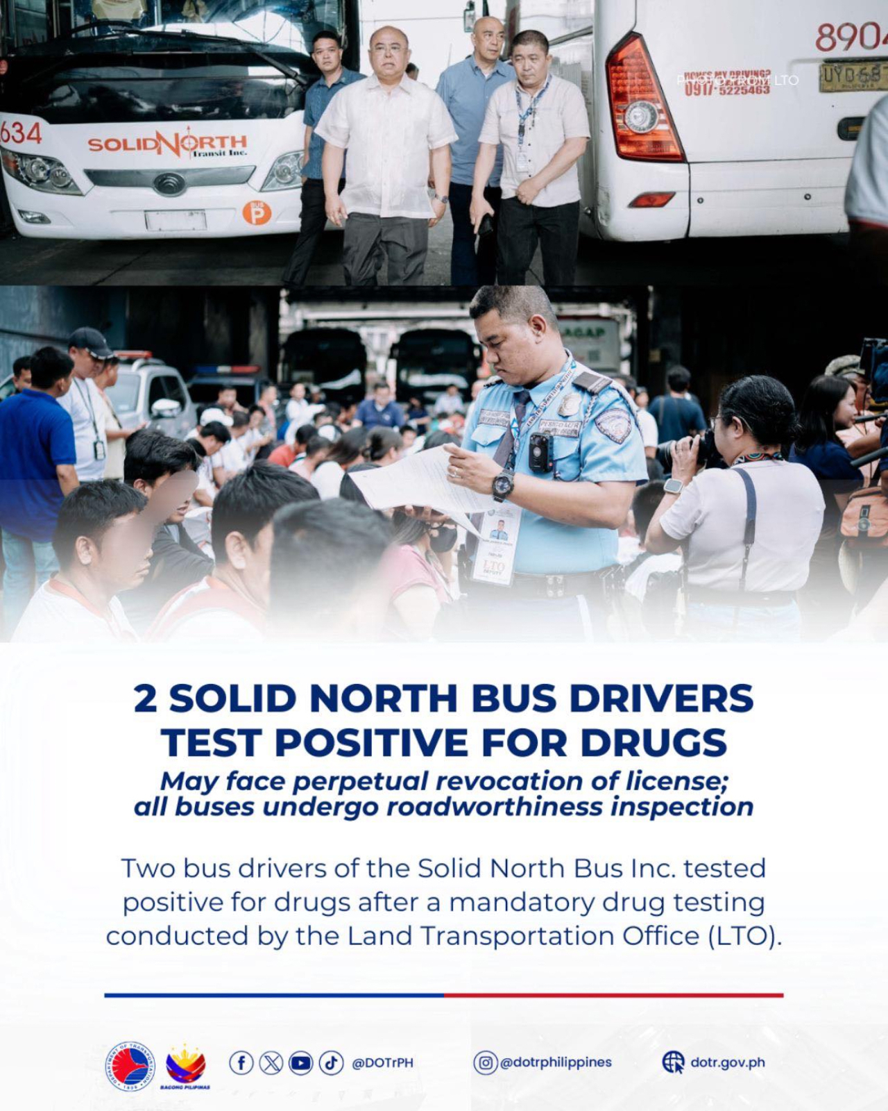 The Department of Transportation (DOTr) has announced that 2 drivers from the bus company, Pangasinan Solid North Transit Inc., have tested positive for illegal drugs, which was conducted by the Land Transportation Office (LTO).