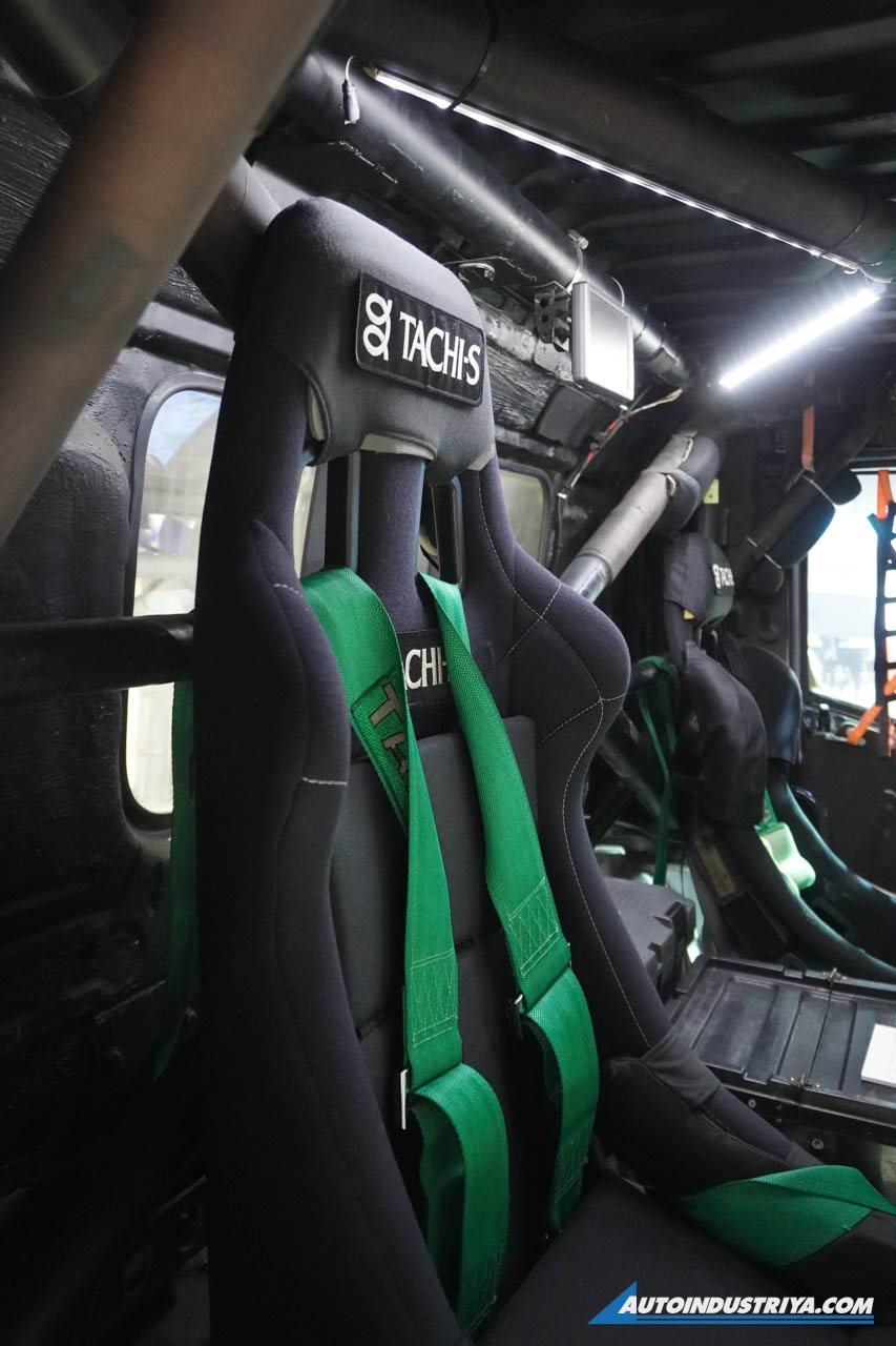 Like all purpose-built race machines, the interior is all business, stripped of anything that doesn’t contribute directly to performance or survival. Beyond the fully integrated roll cage, the cab is fitted with a pair of fixed racing bucket seats, each secured with Takata multi-point harnesses to keep the crew firmly planted during violent terrain impacts. The controls are a purposeful blend of rugged and precise: a stock gearshift lever for absolute mechanical reliability, a leather-wrapped Nardi Torino steering wheel for confident grip, and a compact switch panel that consolidates the truck’s most critical systems within arm’s reach.