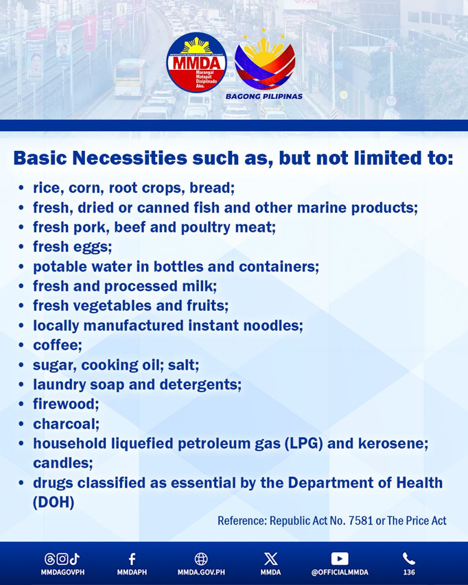 These essential goods include rice, corn, bread, fresh and processed meat, fish, eggs, milk, fruits, vegetables, potable water, cooking oil, sugar, coffee, laundry and toilet supplies, LPG, kerosene, candles, and DOH‑classified essential drugs, as well as prime commodities like flour, canned goods, dairy products, seasonings, fertilizers, feeds, construction materials, electrical supplies, and other non-essential drugs.