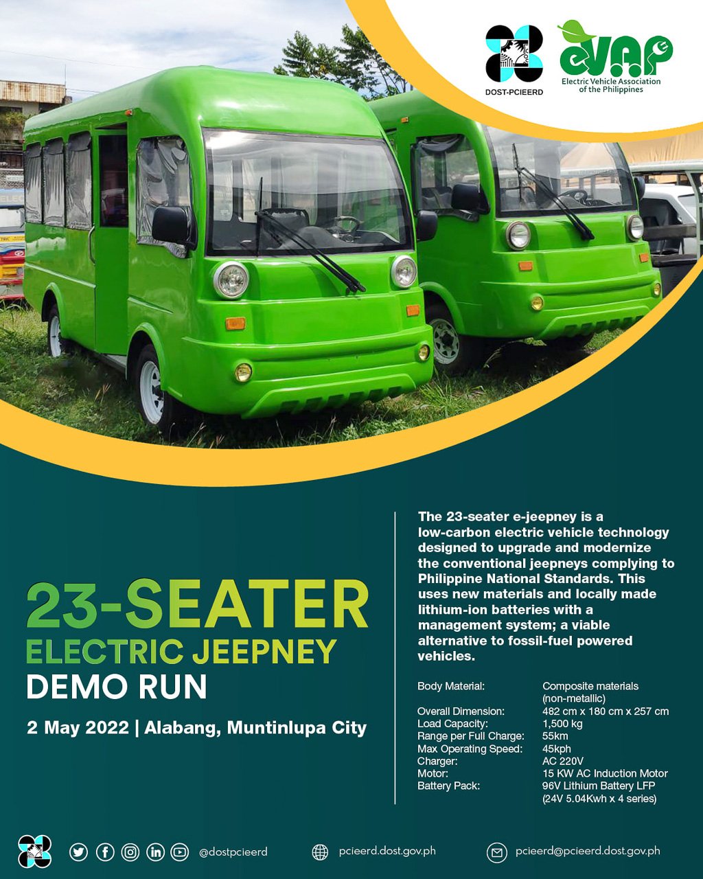 “This revolutionized jeepney is designed to comply to the new vehicle Philippine National Standard by utilizing new materials and locally-made lithium-ion batteries with battery management system. This innovation helps reduce CO2 emissions, fossil fuel consumption, fuel costs, and noise pollution. This 23-seater e-Jeepney is a viable alternative to a regular diesel jeepney and complies with the government's Public Utility Vehicle Modernization Program (PUVMP),” said the DOST in a statement.